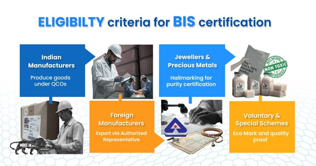 Manufacturers specifically dealing with products like gold and silver jewellery can apply for registration under the Hallmarking Scheme. This applies to jewellers who wish to certify the purity of their precious metal articles. Similarly, manufacturers of eco-friendly products can apply under the Eco Mark Scheme to highlight their environmental commitment alongside quality.