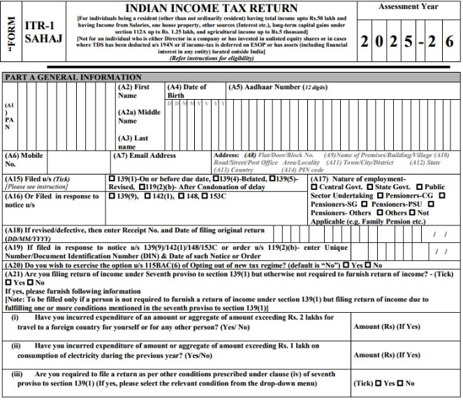 ITR-1 Sahaj is a simple return form designed for individuals with straightforward income sources. It is meant for those whose total income does not exceed Rs. 50 lakh during the financial year.
