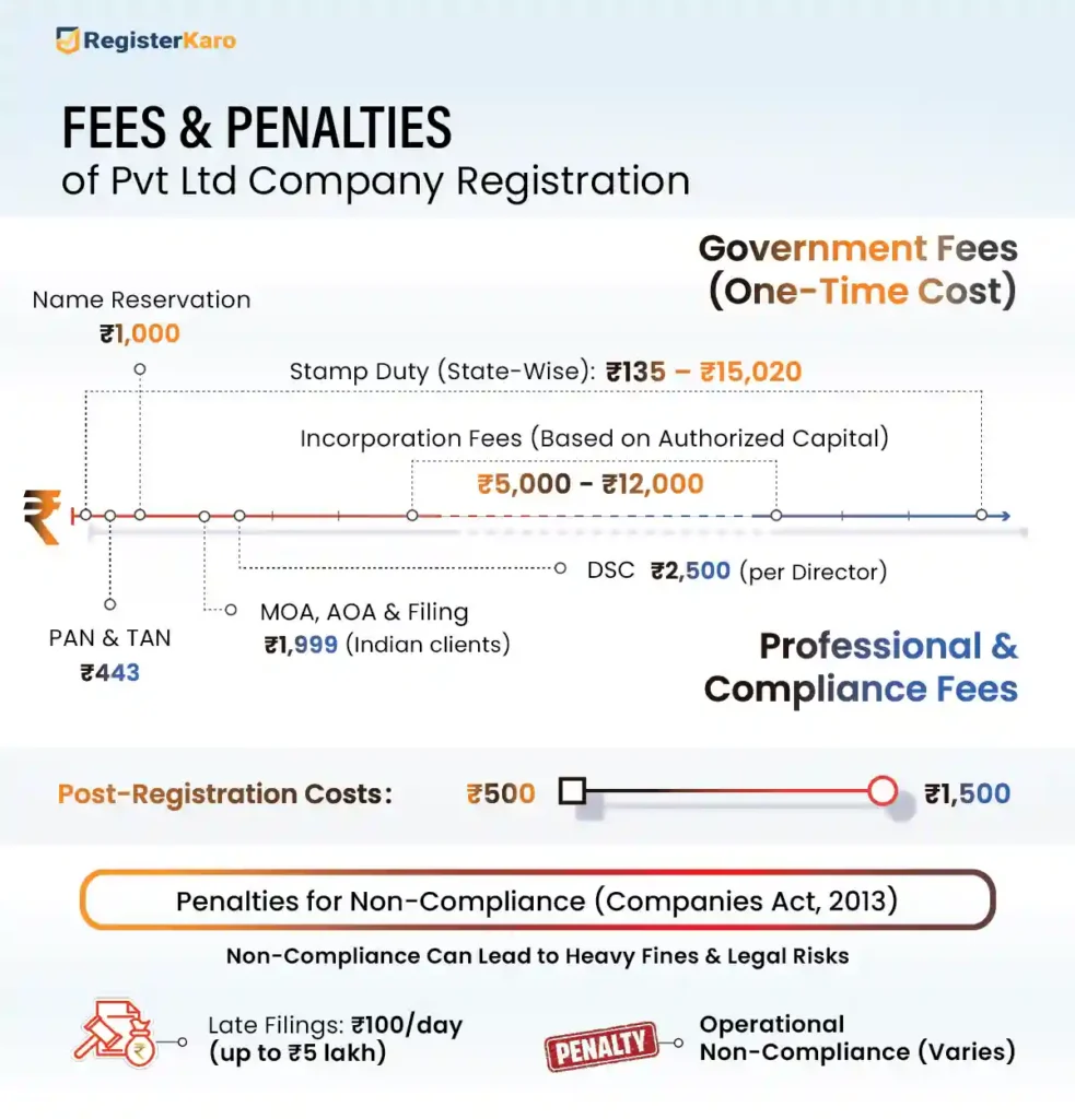 The total cost of Private Limited Company registration in India ranges between ₹10,000 and ₹15,000, including all fees. Government charges alone are about ₹4,000–₹5,000, depending on authorized capital.